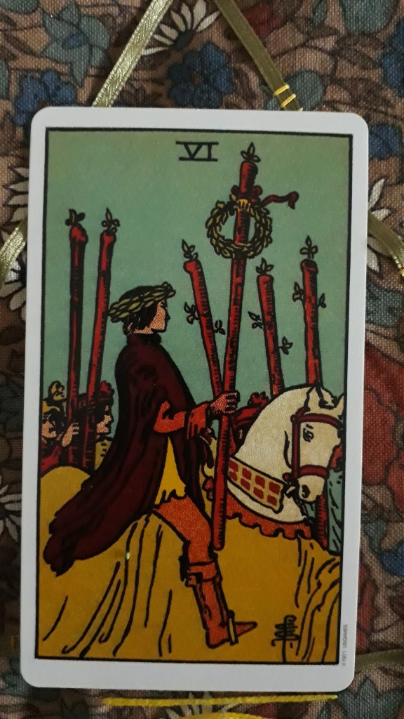 Avem un călăreț pe un cal alb(simbol al purității, al drumului autentic) care poartă bagheta și coroana de flori în vârful acesteia(simbol al succesului și împlinirii), care merge privind înainte într-o mare de oameni/baghete.